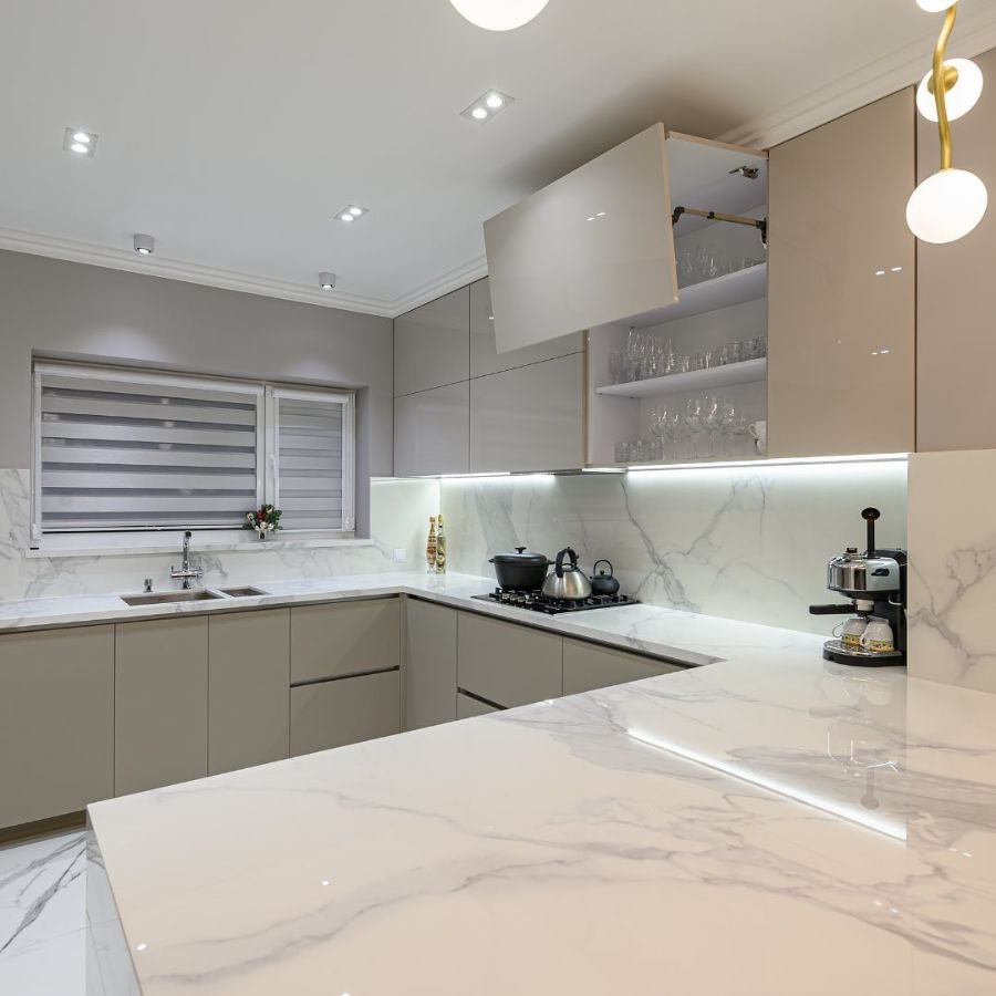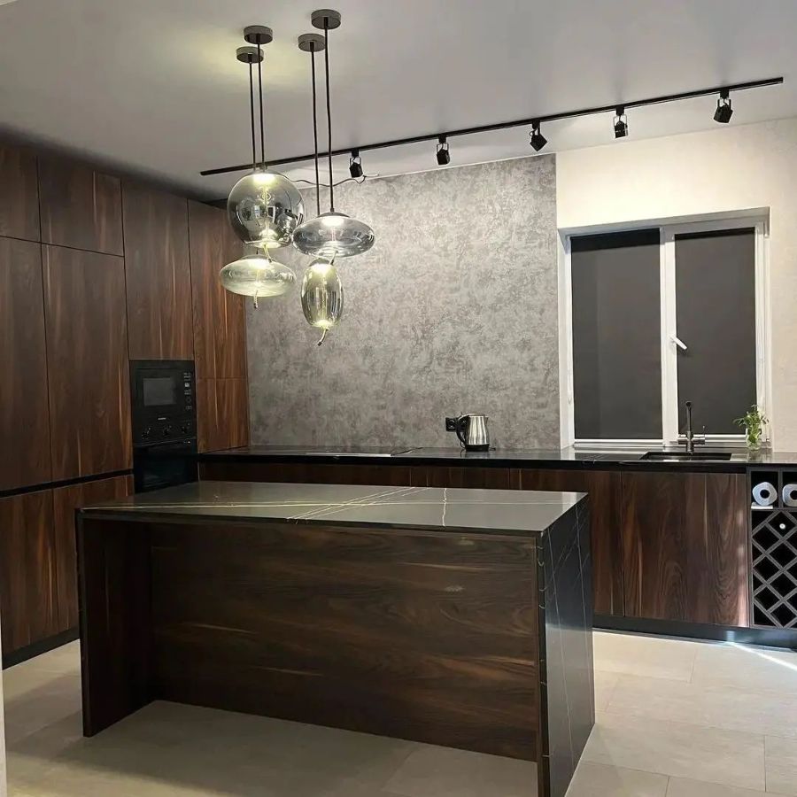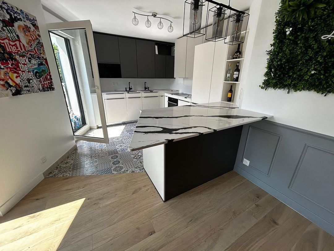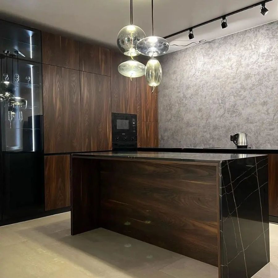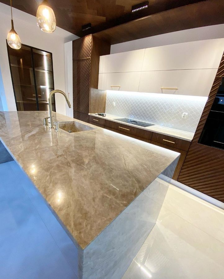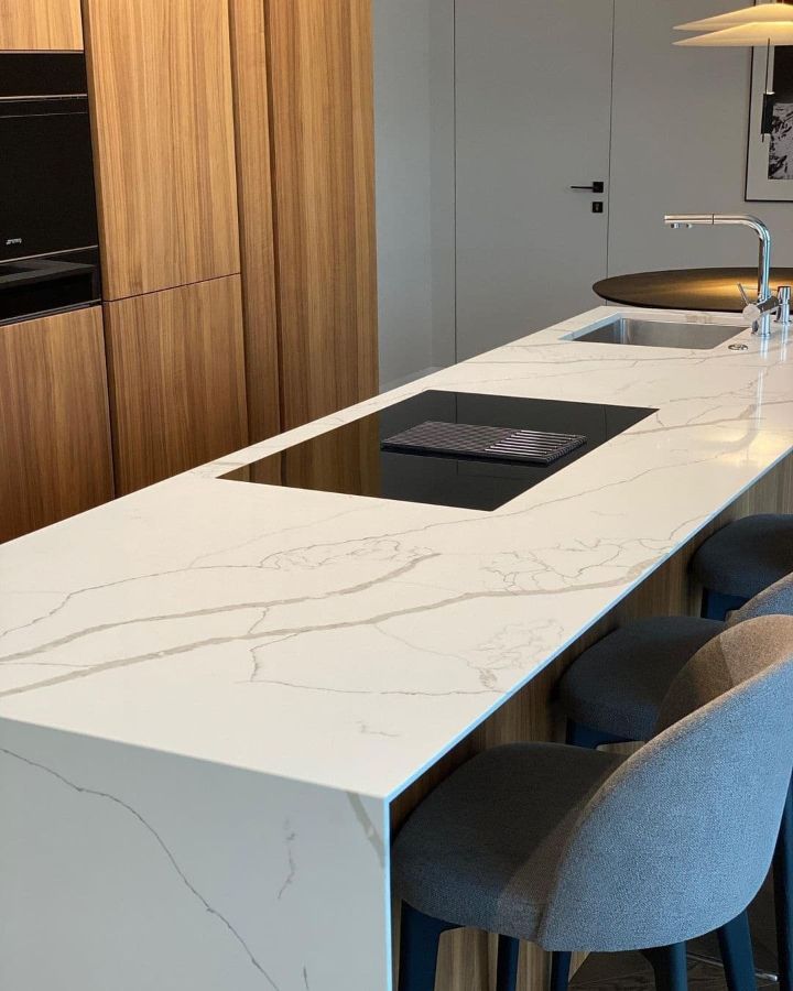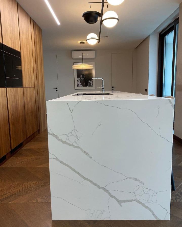 Кухонная столешница и остров изготовлен из кварцевого агломерата
