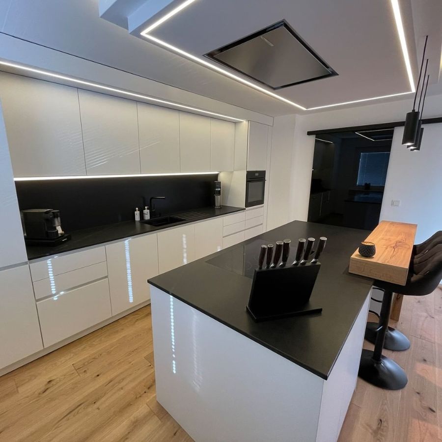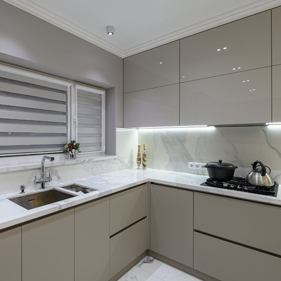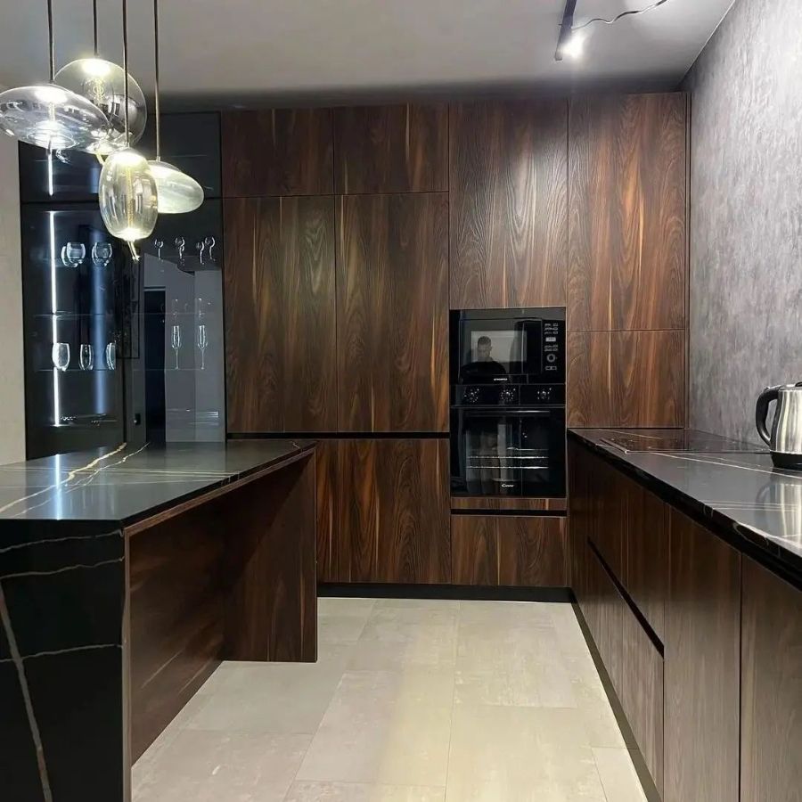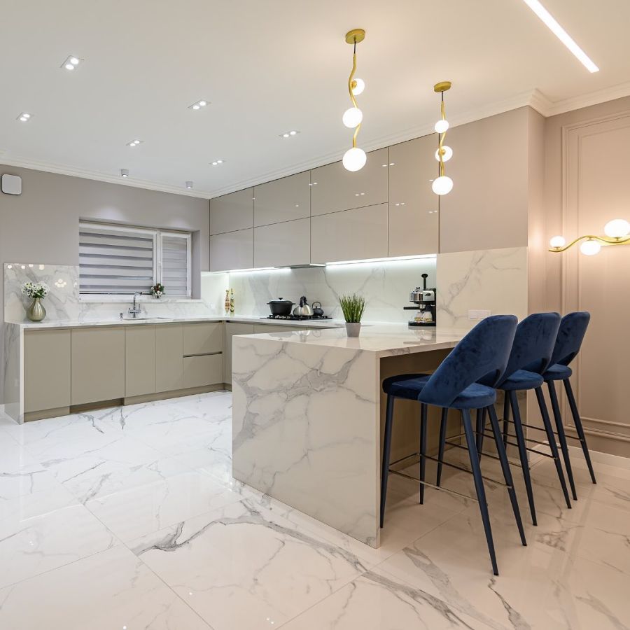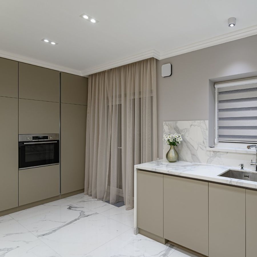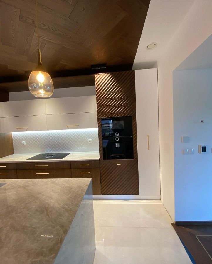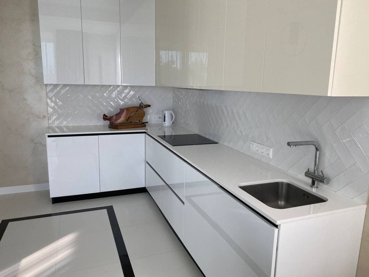 Кухонная столешница и остров изготовлен из кварцевого агломерата