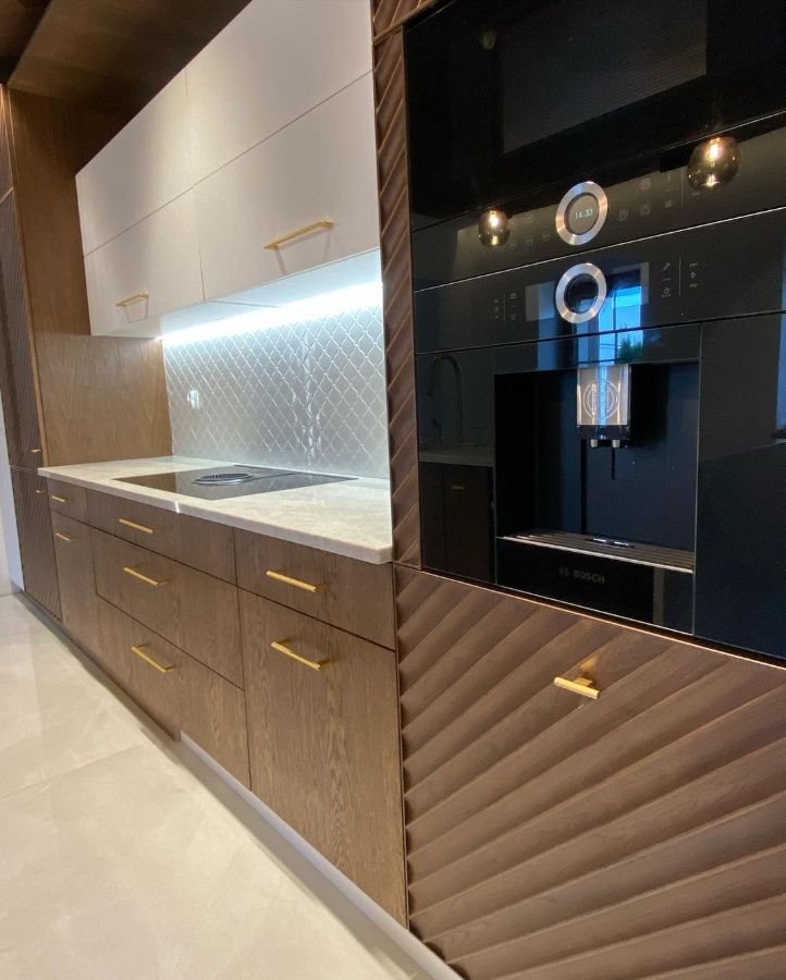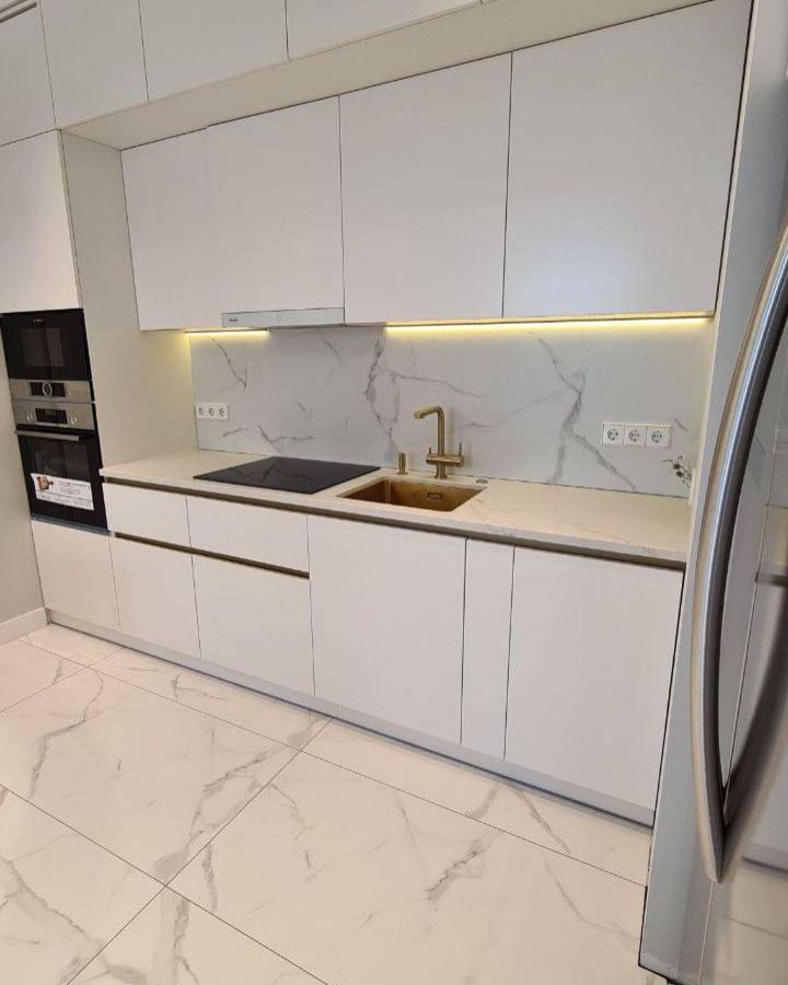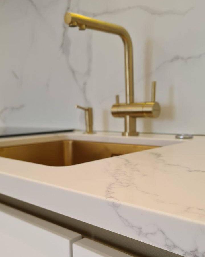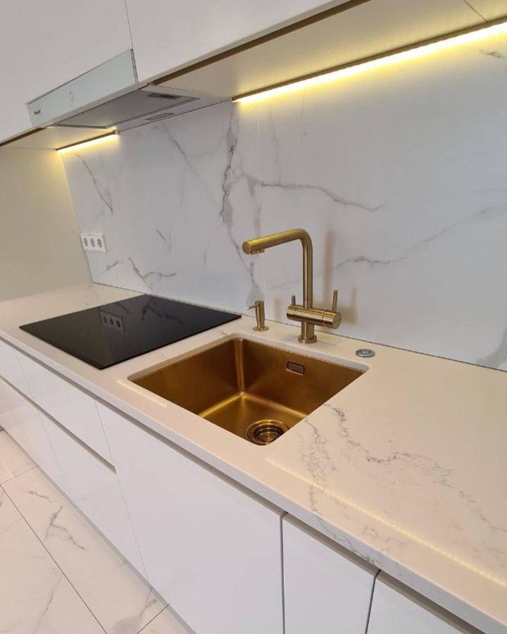 Столешница из кварцевого агломерата для кухни с красивой золотой сантехникой