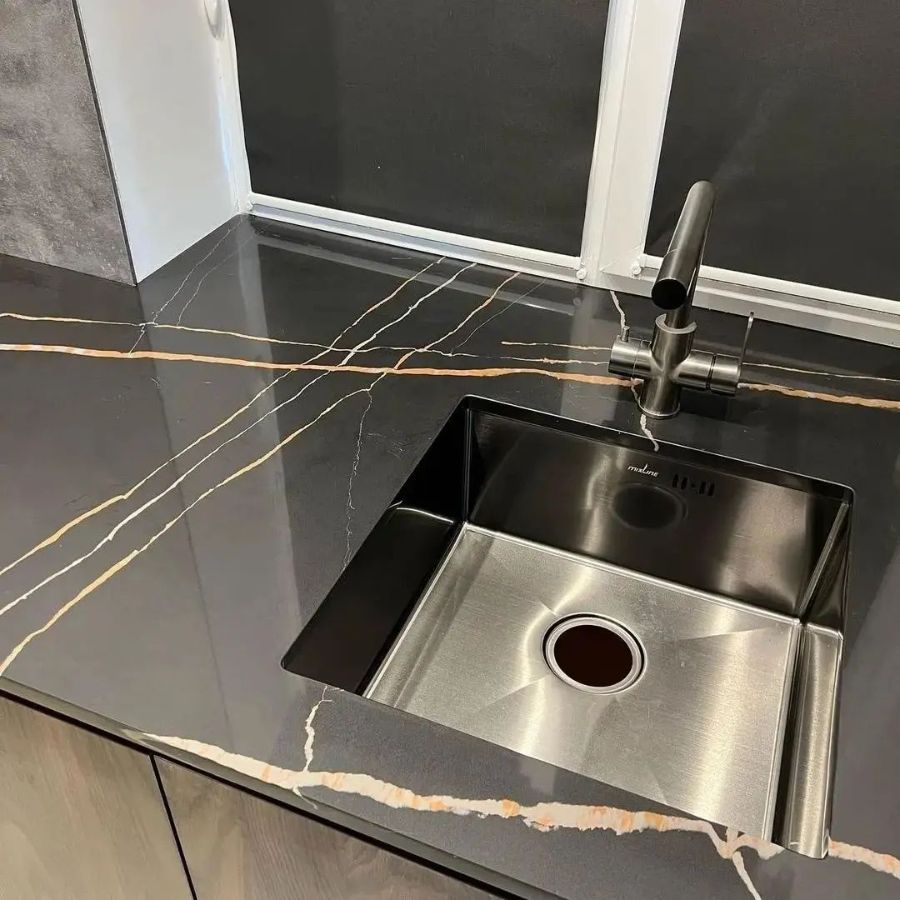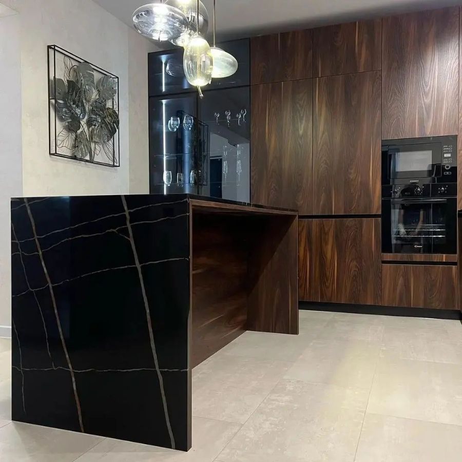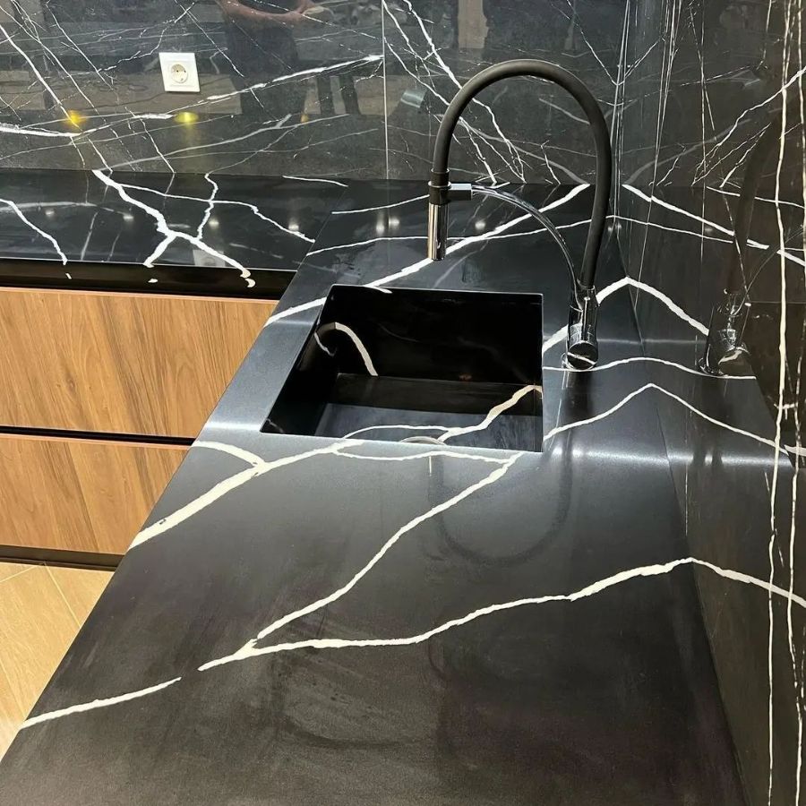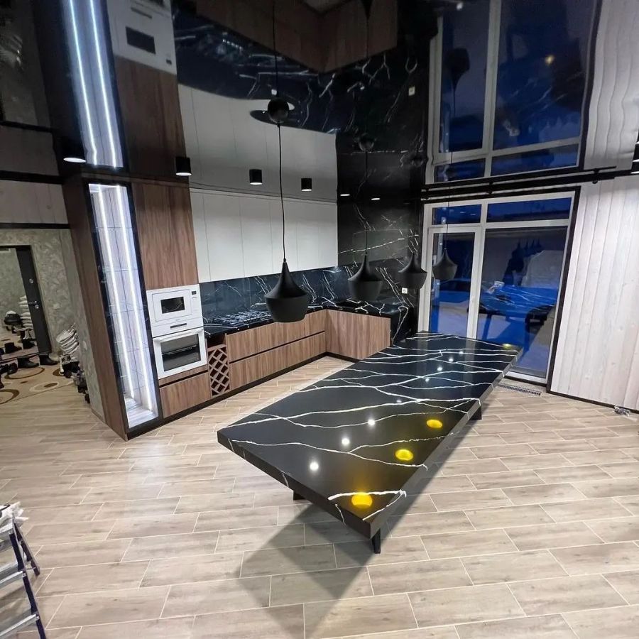 Изготовлена крутая столешница из кварцевого агломерата negro marquina