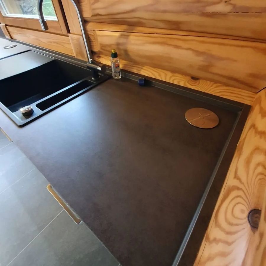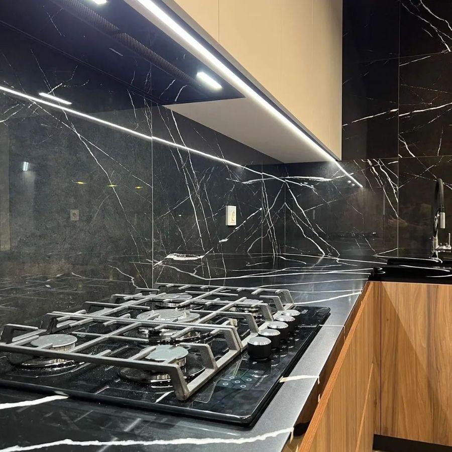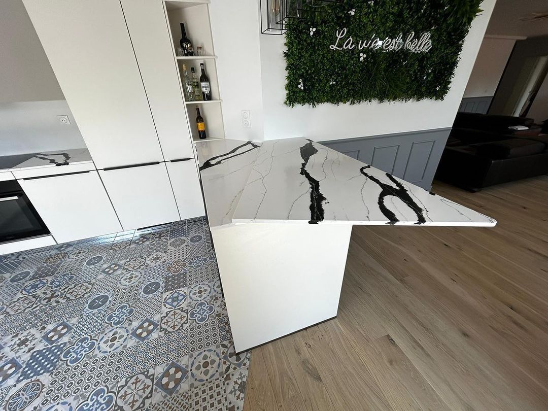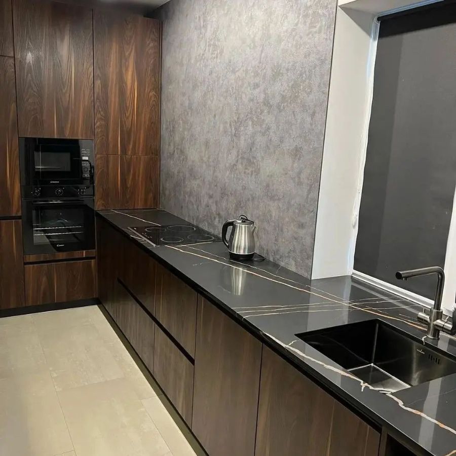 Изготовлена крутая столешница из кварцевого агломерата negro marquina