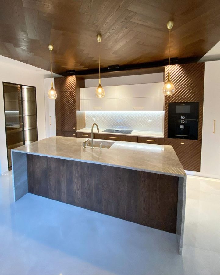 Столешница на кухню и на остров с фартуком из кварцевого агломерата. Цена проекта 225 000 рублей.