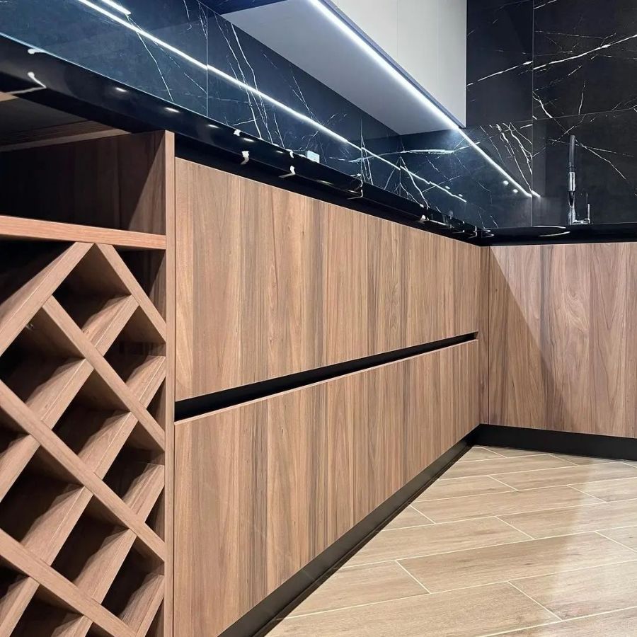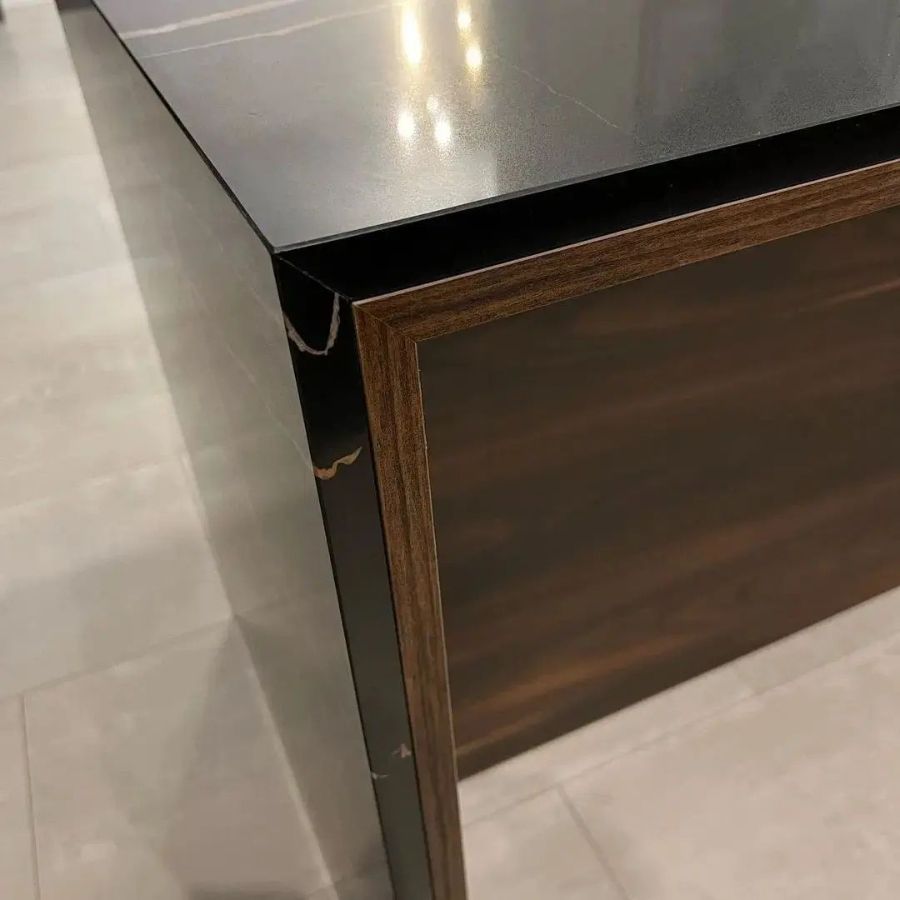 - Сложности выполнения заказа. Дешевле всего обойдется прямая или угловая форма столешницы с обычным радиусом кромлением, без дополнительного декора. А вырезы под раковину или плиту, металлические, каменные инкрустации на фасаде, причудливая фаска или плинтус по индивидуальному эскизу дизайнеров, повысят итоговую стоимость проекта;