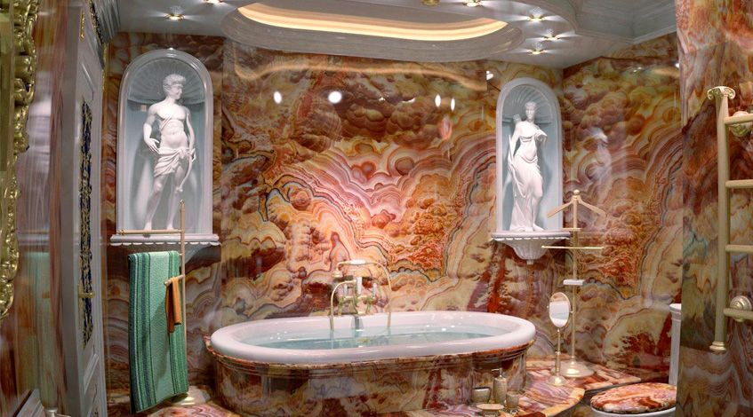 Дома ониксовым стенам самое место – эффектные, не токсичные, гипоаллергенные и совершенно натуральные. Уникальная красота камня не обсуждается. Повторить точно такое же настенное панно или сплошную облицовку не получится. Орнамент на камне не повторяется – его подбор является довольно трудоемкой задачей. Один и тот же сорт оникса в разных интерьерах смотрится по-разному. Имеет значение освещение, габариты и планировка комнаты.